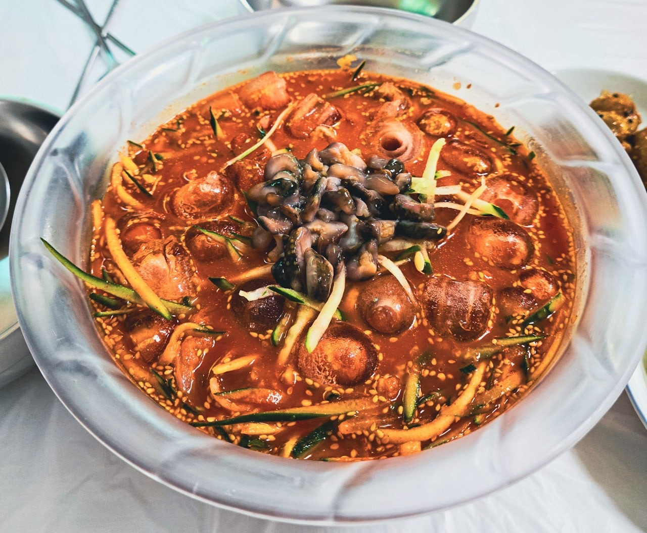 해삼을 썰어 올린 뒤 얼음을 띄워 줍니다.
